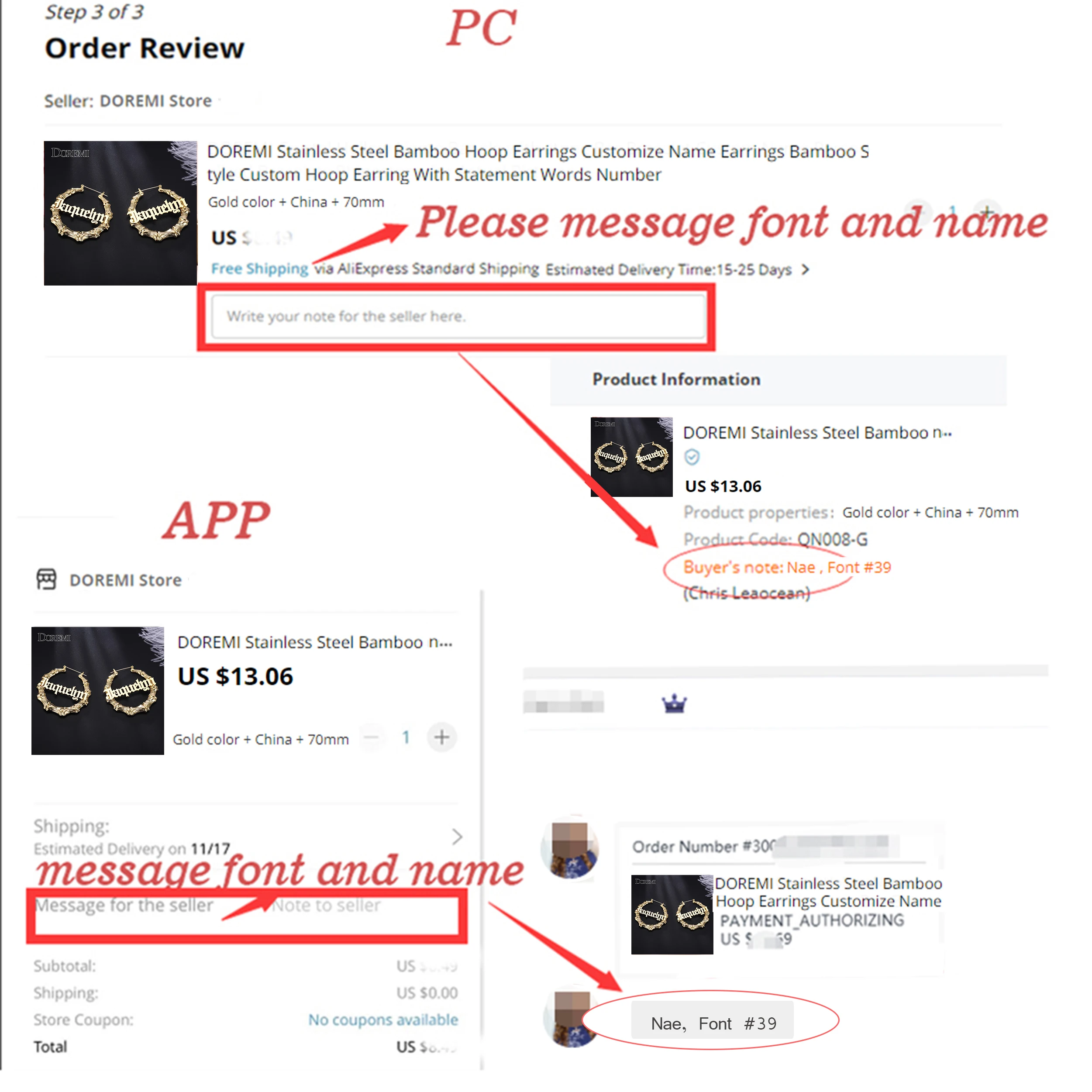 1. When you want to customize jewelry, you need to leave message the name and font on the order remarks (for example:name:Zahara font:4) or you can directly send a message to tell us the name and font you need to customize. We would show you the drawing effect if you need.